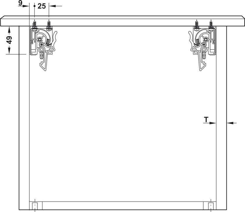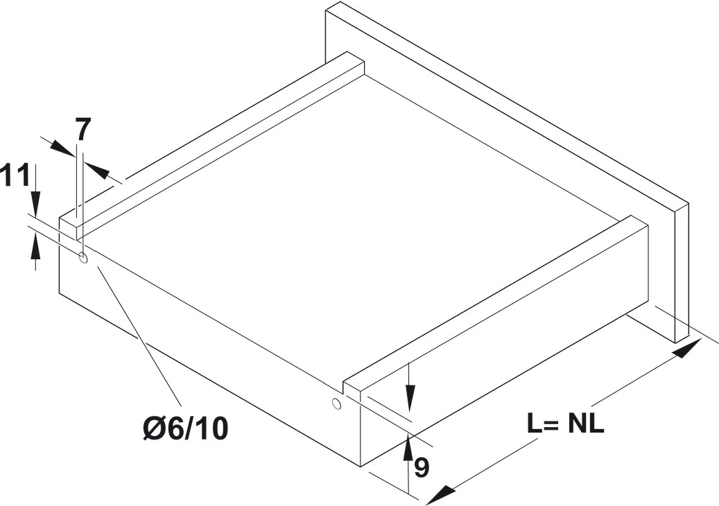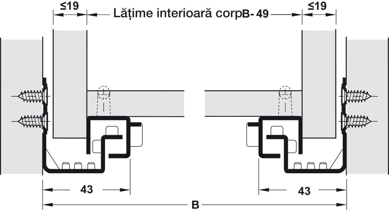 Dimensiuni - Lățime sertar = lățime interioară corp (B) - 49 mm + 2x grosime laterale sertar mm